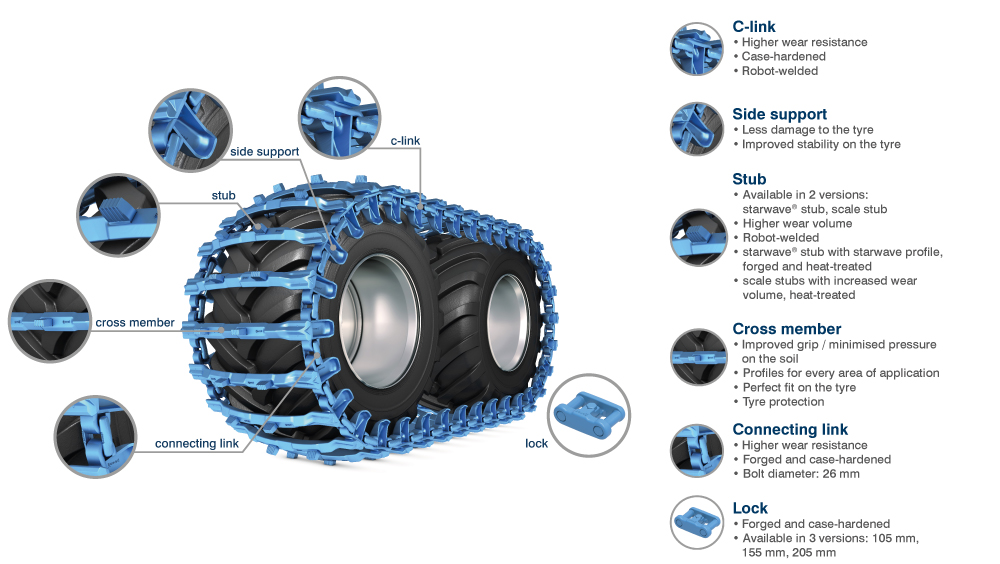 Datorită profilului inovator pewag starwave® și dispunerii asimetrice a crampoanelor, tracțiunea este îmbunătățită semnificativ. Indiferent de caracteristicile solului, crampoanele dispuse asimetric se fixează bine în sol. În plus, profilurile individuale ale barelor transversale oferă pentru toate solurile o fixare îmbunătățită și cresc capacitatea de rulare pe teren chiar și în cazul unei eventuale supraîncărcări a utilajului.